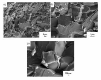 圖1(a)、(b)、(c)分別為Ti(C,N)基金屬陶瓷復(fù)合材料的5000倍、10000倍及30000倍掃描電鏡照片(SEM)。從圖1(a)中可以看到,復(fù)合材料斷口的微觀結(jié)構(gòu)形貌組織致密度高,夾雜閉口氣孔的數(shù)量極少,晶界分明且晶粒尺寸細(xì)小,裂紋的斷裂路線走向明了、清晰,呈蛛網(wǎng)狀分布,斷面高低起伏,凹凸程度高,同時存在穿晶斷裂和沿晶斷裂方式,金屬撕裂棱明顯,存在較大的解理面。于圖1(b)10000倍和圖1(c)30000倍照片中可以清晰的看到,較大解理面上存在明顯的波紋樣紋路,說明在穿晶斷裂方式中仍存有更細(xì)微的裂紋偏轉(zhuǎn),同時斷面中存在尖“V”形斷裂形貌(如圖1(c)中所示),這對于性能的提升是有利的。試樣各項性能指標(biāo)分別達(dá)到:維氏硬度11.9GPa,彎曲強(qiáng)度1255MPa,斷裂韌性8.3MPa·m1,相對密度98.7%。說明熱壓燒結(jié)工藝有利于材料微觀組織致密化、均勻化程度提升,晶粒細(xì)化以及斷裂路線多樣變化等均有助于復(fù)合材料綜合性能的提高。這可能是受益于熱壓燒結(jié)工藝在燒結(jié)過程中有外力引入的特點,熱壓燒結(jié)過程中的高壓高溫有利于改善陶瓷材料的粘性流動、傳質(zhì)過程以及擴(kuò)散遷移能力,使其能在較低的溫度和較短的時間內(nèi)獲得較理想的性能指標(biāo),但同時熱壓燒結(jié)工藝存在著無法制備造型復(fù)雜的制品且產(chǎn)能低等缺點。