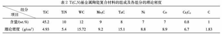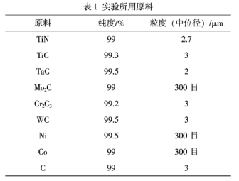 金屬陶瓷(cermet)是由一種或幾種金屬組分與陶瓷材料經(jīng)過復(fù)合而成的一種非均質(zhì)材料,其中,陶瓷組分約占15~85 vol%。Ti(C,N)基金屬陶瓷復(fù)合材料出現(xiàn)于20世紀(jì)70年代,由于其具有硬度高,較理想的高溫性能和耐磨性,較好的化學(xué)穩(wěn)定性,以及較高的抗月牙洼磨損能力與抗氧化能力等性能優(yōu)點,因而廣泛應(yīng)用于切削刀具、耐磨材料等領(lǐng)域。地殼中Ti資源含量豐富,成為可代替稀缺資源WC基硬質(zhì)合金材料的候選材料之一,因此近年來Ti(C,N)基金屬陶瓷復(fù)合材料成為熱門研究方向。Ti(C,N)基金屬陶瓷材料以Ti(C,N)為基礎(chǔ)硬質(zhì)相(添加方式主要是直接添加Ti(C,N)或者添加TiC與TiN再合成Ti(C,N),后者具有經(jīng)濟(jì)優(yōu)勢),采用Ni、Co或(和)Mo等金屬或合金為粘結(jié)相,根據(jù)工況添加其他一些難熔的氮化物或碳化物(如SiN?、AIN、WC、MoC、VC等)為增強(qiáng)相而制成的一種復(fù)合材料。本實驗以TC和TiN為基礎(chǔ)原料合成Ti(C,N),添加碳化物WC、MoC、CrCa、TaC作為補強(qiáng)相,以Ni和Co為復(fù)合金屬粘結(jié)相,通過熱壓燒結(jié)工藝制備了Ti(C,N)基金屬陶瓷復(fù)合材料。