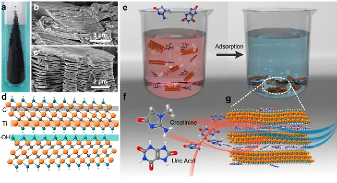 美國德雷塞爾大學Yury Gogotsi教授團隊[6]將Ti3C2Tx,一種已知能有效吸附尿素的MXenes材料,用于從水溶液和透析液中去除肌酐和尿酸,最大吸附量分別為45.7和17.0 mg g-1。作者系統(tǒng)地分析和模擬了吸附動力學、等溫線和熱力學,從而確定了限速步驟和吸附機理,并設計了一個裝有Ti3C2Tx的固定床柱,以進一步評估連續(xù)流體流動條件下的吸附性能,反映連續(xù)腎臟替代治療方法的條件。該研究表明,Ti3C2Tx具有作為透析液再生的有效吸附劑的潛力,通過去除過濾的毒素加速透析液再生,實現(xiàn)更便攜的透析設備制造,體現(xiàn)出MXenes材料在醫(yī)藥領域的應用潛力(圖8)。