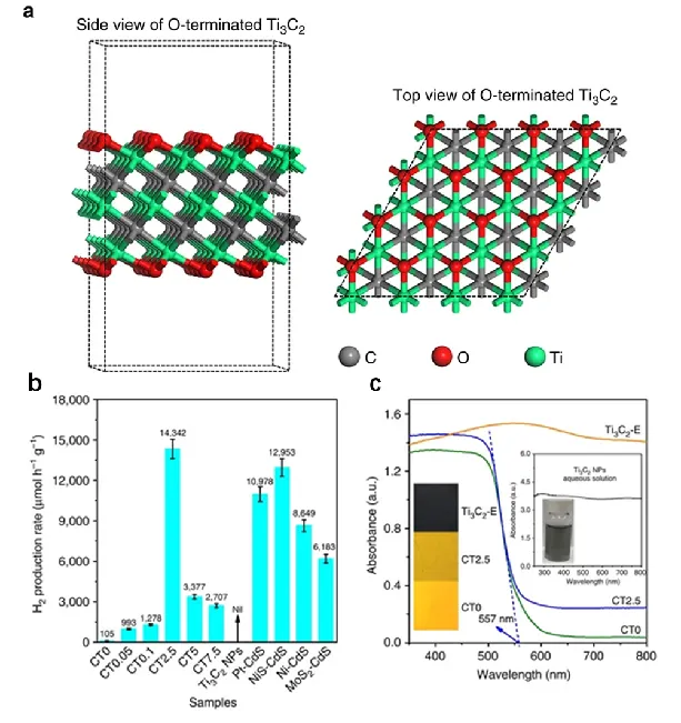 如上圖6所示,喬世璋課題組[4]通過DFT理論計算指導合成了一種具有高效共催化性能的MXene材料:Ti3C2納米顆粒。研究人員通過水熱法將Ti3C2納米顆粒集成到吸光材料CdS表面,實現(xiàn)了活性高達14342 μmol h-1 g-1的可見光催化產(chǎn)氫,且在420 nm處表觀量子效率為40.1%(圖6 b)。該研究成果首次將MXene作為共催化劑引入到光解水產(chǎn)氫體系中,證明了MXene在取代Pt,構建低成本、高性能光電極或者光催化劑方面展現(xiàn)出來的巨大潛力。