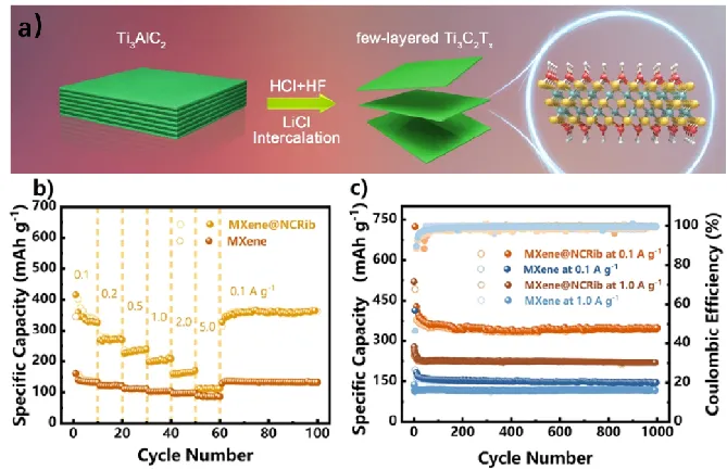 吉林大學韓煒等人[3]通過原位生物吸附策略,將MXene@N摻雜的碳納米纖維結構設計為高性能鈉離子和鉀離子電池的陽極。將Ti3C2Tx納米片組裝到黑曲霉上生成真菌納米帶,并轉換為2D/1D異質結構。這種微生物來源的二維MXene-1D氮摻雜碳質納米纖維結構具有完全開放的孔隙和傳輸通道,具有高可逆容量和長期穩(wěn)定性,可存儲Na+(349.2 mAh g-1在0.1A g-1循環(huán)1000次)和K+(201.5 mAh g-1在1.0 A g-1循環(huán)1000次)(圖5)。離子擴散動力學分析和密度泛函理論計算表明,這種多孔雜化結構促進了Na和K離子的傳導和輸運,充分利用了二維材料固有的優(yōu)勢。因此,本研究拓展了MXene材料的潛力,并為解決二維材料在儲能領域應用的挑戰(zhàn)提供了一個很好的策略。