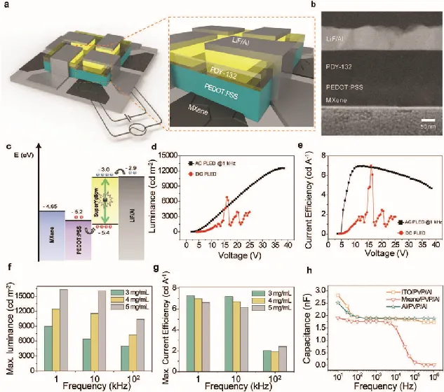 (f-g)最大亮度和電流效率與頻率的關系;(h)不同電極的電容