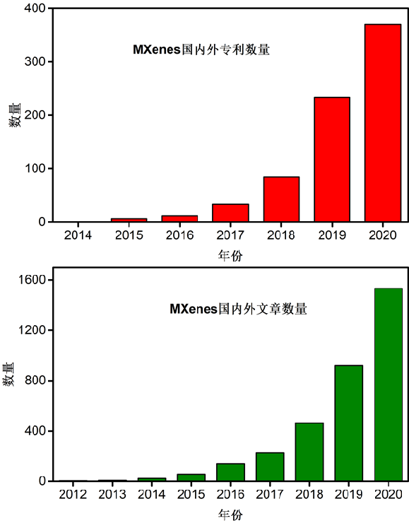 圖2 從“Web of Science”網(wǎng)站統(tǒng)計與MXenes相關的文章及國內(nèi)外專利數(shù)量