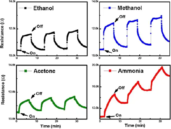 奧本大學Dong-Joo Kim教授[7]第一次報道了基于Ti3C2Tx的氣體傳感器,并籍此測試了乙醇、甲醇、丙酮和氨氣。作者將合成的Ti3C2Tx納米薄片用易操作的溶液澆鑄法制備在柔性聚酰亞胺薄膜上,并對其表面化學性質進行了研究。如圖9所示,Ti3C2Tx傳感器在室溫下成功地檢測了乙醇、甲醇、丙酮、氨氣等氣體,表現(xiàn)出p型傳感行為。由于Ti3C2Tx傳感器具有較大的吸收能量,因此對氨氣有較高的傳感響應。根據(jù)傳感材料與傳感材料之間的相互作用產(chǎn)生的多數(shù)電荷載流子轉移,提出了該傳感器可能的傳感機理。這種新型的Ti3C2Tx氣體傳感器將是未來可穿戴電子設備的新一代通用傳感器,其性能可與其他2D材料傳感器相媲美,這也為MXenes材料在傳感器方面的應用提供了一個新的方向。