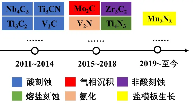 隨著MXenes家族的壯大,對MXenes材料的研究也日益增多。圖3羅列了發(fā)現(xiàn)MXenes材料的進展的簡要時間表。可以看到近幾年MXenes材料的發(fā)展速度越來越迅速,并且可以從圖中看到制備MXenes材料的工藝流程也越來越豐富,逐漸從使用高毒性和高腐蝕性的HF溶液發(fā)展到通過熔融鹽、高溫堿溶液和電化學方法剝離等更豐富更綠色健康的方法和工藝[2]。