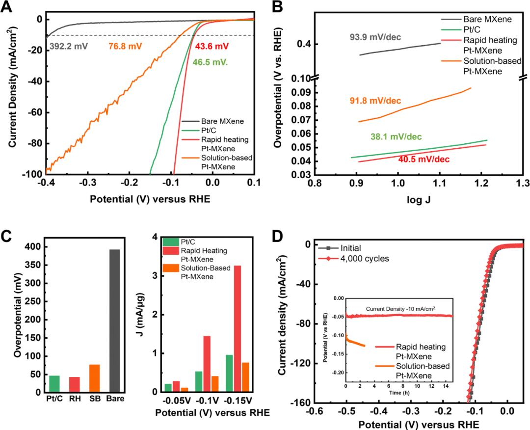 圖3 展示了快速加熱Pt-MXene作為電催化劑在HER中的性能。快速加熱Pt-MXene表現(xiàn)出低過電位和高催化活性,與商業(yè)Pt/C相比具有更高的質(zhì)量活性和更低的Tafel斜率。這歸因于Pt納米顆粒的均勻分布和MXene表面在合成過程中的保護(hù),從而最大化了催化活性位點(diǎn)的暴露。此外,快速加熱Pt-MXene在長期穩(wěn)定性測試中顯示出優(yōu)異的穩(wěn)定性,遠(yuǎn)超過溶液處理的Pt-MXene。