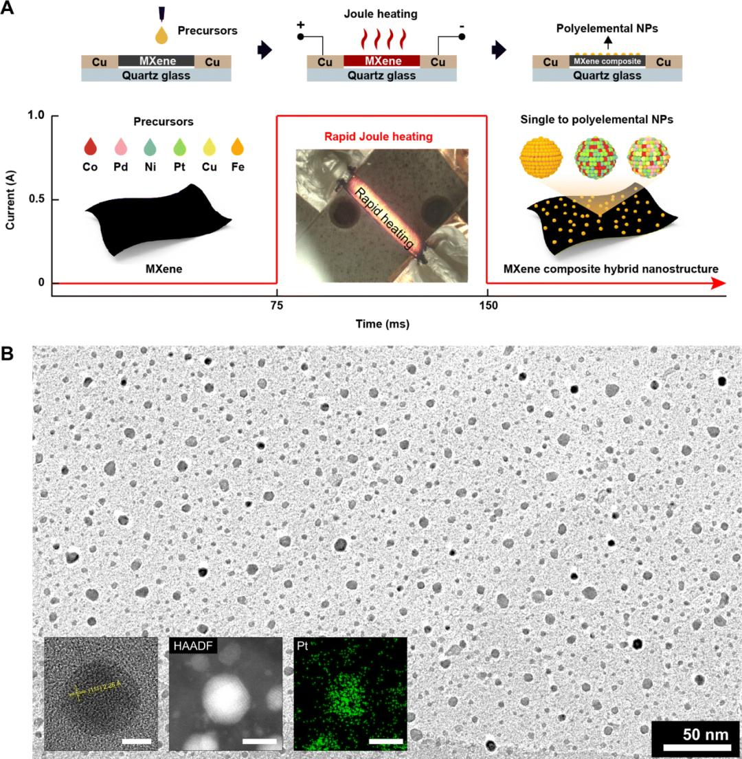 針對上述問題,韓國科學(xué)技術(shù)院(KAIST)Hee-Tae Jung等提出了一種無需溶液的MXene基復(fù)合雜化納米結(jié)構(gòu)合成方法,利用快速焦耳加熱技術(shù)克服了傳統(tǒng)溶液法在合成過程中MXene氧化的缺點(diǎn)。通過向MXene基材上加載前驅(qū)體并施加快速熱沖擊,成功合成了包含Pt、Co、Cu、Ni、Fe、Pd及其合金等多種成分的MXene復(fù)合雜化納米結(jié)構(gòu)。實(shí)驗(yàn)結(jié)果顯示,快速焦耳加熱技術(shù)具有多方面優(yōu)勢,包括最小化MXene氧化、雜化成分分布均勻無嚴(yán)重團(tuán)聚、以及多元合金合成均勻性。研究通過合成的Pt-MXene納米復(fù)合材料展示了該方法的有效性,該復(fù)合材料在氫析出反應(yīng)(HER)中表現(xiàn)出優(yōu)異的電催化活性和穩(wěn)定性。這一技術(shù)不僅保留了MXene的獨(dú)特性質(zhì),還適用于多種應(yīng)用場景,特別是在MXene復(fù)合材料的協(xié)同效應(yīng)能夠帶來性能顯著提升的領(lǐng)域。