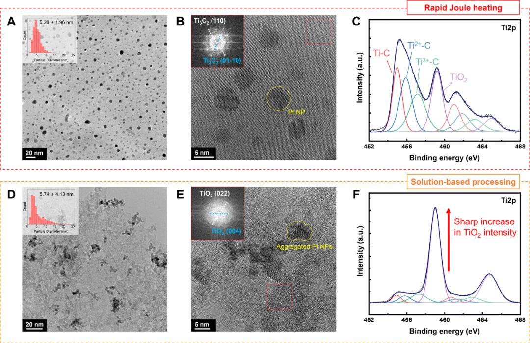 圖2 比較了快速加熱和傳統(tǒng)溶液處理方法制備的Pt-Ti3C2Tx MXene復(fù)合納米結(jié)構(gòu)的表面結(jié)構(gòu)和形貌。快速加熱法制備的Pt納米顆粒表現(xiàn)出高度均勻分散,而溶液處理法則導(dǎo)致Pt納米顆粒在MXene表面嚴(yán)重聚集。此外,快速加熱法顯著減少了MXene的氧化,而溶液處理法則導(dǎo)致MXene氧化成TiO2。XPS和XRD分析進(jìn)一步證實(shí)了快速加熱法在合成過程中對MXene的保護(hù)作用,減少了氧化。