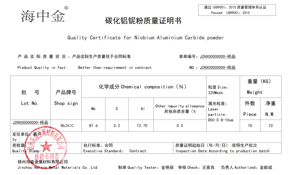 產品名稱:碳化鋁鈮(Nb2AlC)