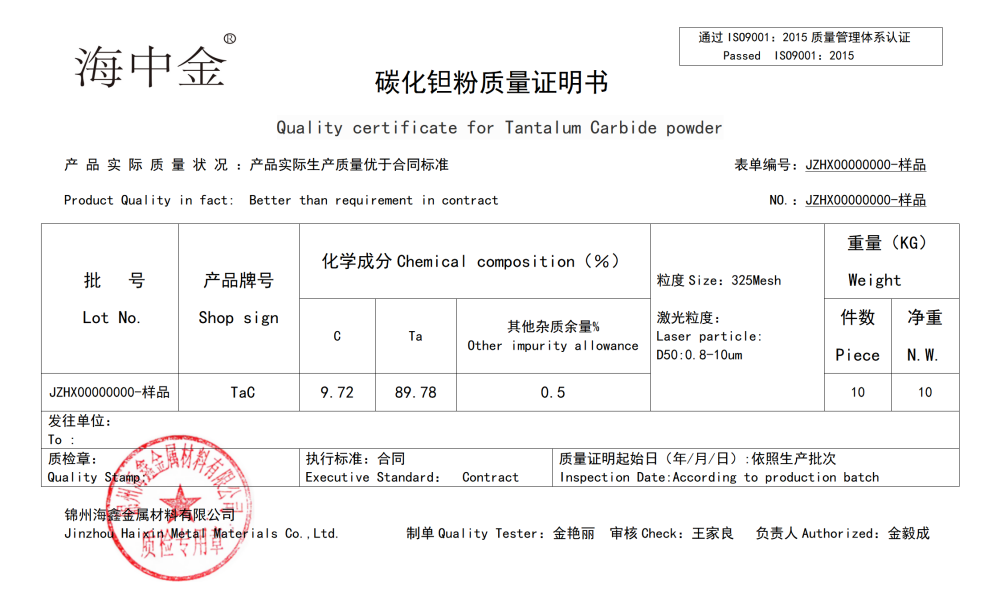 化合法是一種常見的固相法制備TaC工藝。在一定的條件下,Ta和C發(fā)生化學反應直接生成TaC:Ta(s)+C(s)→TaC(s)