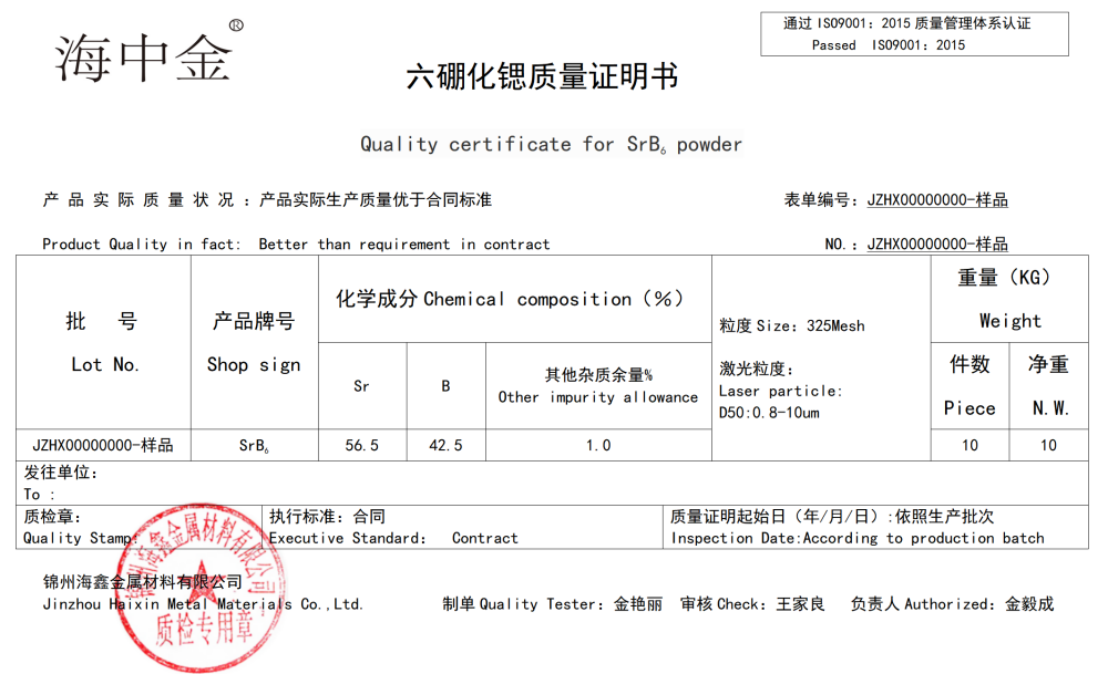 性質(zhì):六硼化鍶(SrB6)室溫下為黑色晶狀粉末,非常穩(wěn)定,熔點高,密度大。
