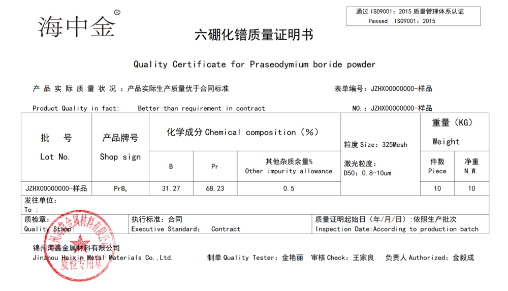 產(chǎn)品名稱:六硼化鐠(PrB6)
